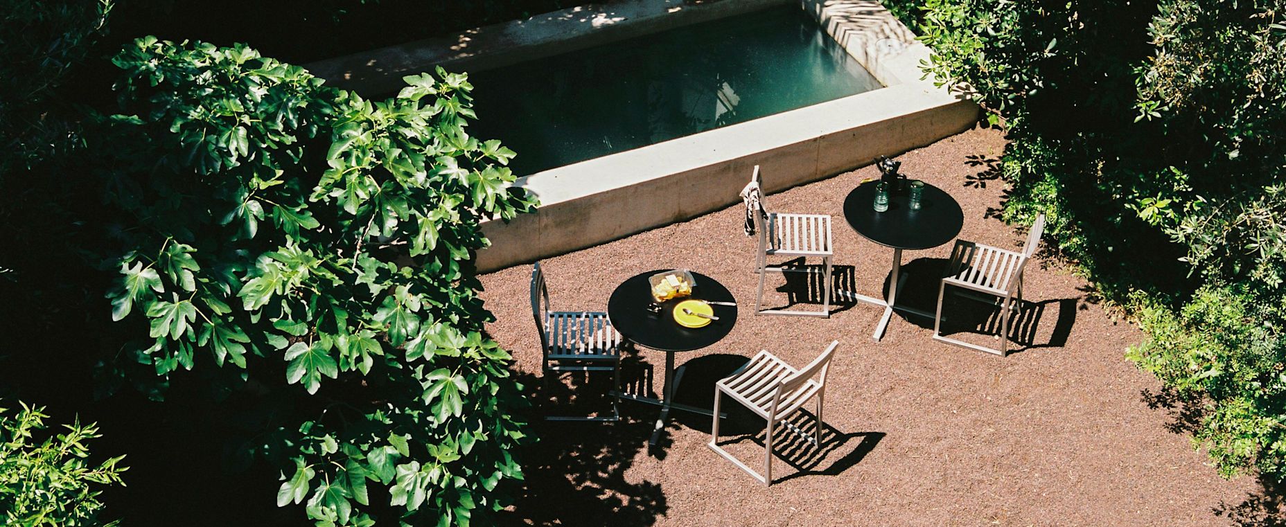A lifestyle image of an outdoor scene featuring the Chop outdoor collection.