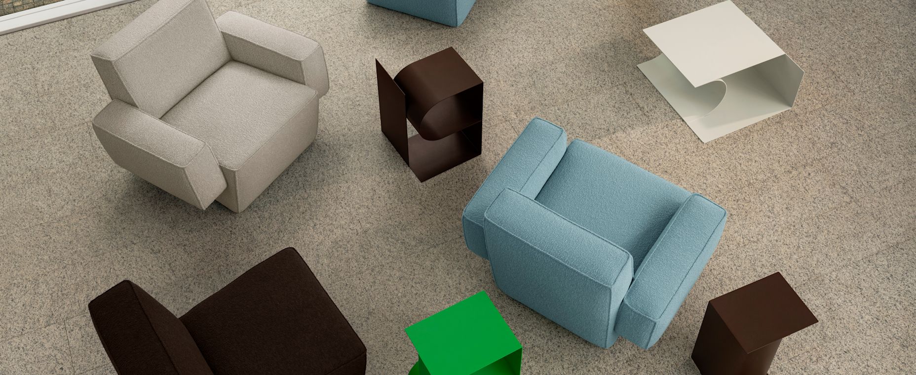 A lifestyle image featuring Hunk Lounge Chair, Hunk Lounge Chair with Armrests, and Glyph Side Tables Alpha, Beta and Gamma.